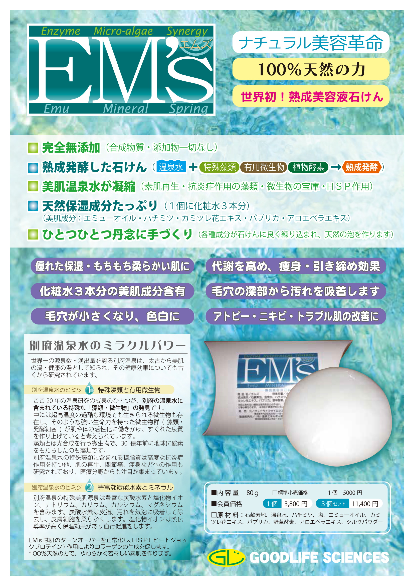 ■完全無添加(合成物質・添加物一切なし) ■熟成発酵した石けん (温泉水+特殊藻類 有用微生物 植物酵素→熟成発酵) ■美肌温泉水が凝縮 (素肌再生・抗炎症作用の藻類・微生物の宝庫・HSP作用) ■天然保湿成分たっぷり(1個に化粧水3本分) (美肌成分:エミューオイル・ハチミツ・カミツレ花エキス・パプリカ・アロエベラエキス・シルクパウダー) ■ひとつひとつ丹念に手づくり (各種成分が石けんに良く練り込まれ、天然の泡を作ります)