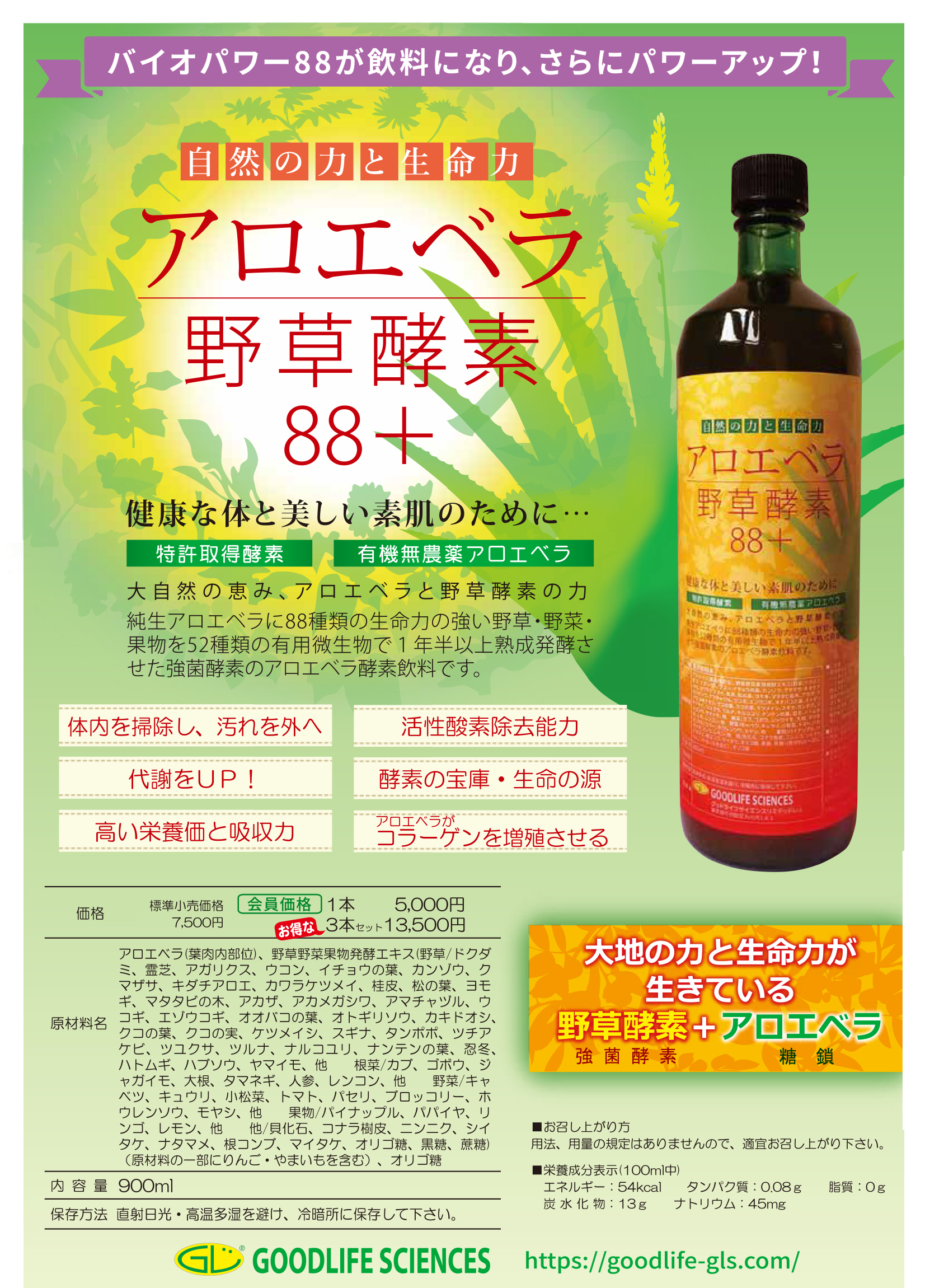 アロエベラ(葉肉内部位)、野草野菜果物発酵エキス(野草/ドクダミ、霊芝、アガリクス、ウコン、イチョウの葉、カンゾウ、クマザサ、キダチアロエ、カワラケツメイ、桂皮、松の葉、ヨモギ、マタタビの木、アカザ、アカメガシワ、アマチャヅル、ウコギ、エゾウコギ、オオバコの葉、オトギリソウ、カキドオシ、クコの葉、クコの実、ケツメイシ、スギナ、タンポポ、ツチアケビ、ツユクサ、ツルナ、ナルコユリ、ナンテンの葉、忍冬、ハトムギ、ハブソウ、ヤマイモ、他 根菜/カブ、ゴボウ、ジャガイモ、大根、タマネギ、人参、レンコン、他 野菜/キャベツ、キュウリ、小松菜、トマト、パセリ、ブロッコリー、ホウレンソウ、モヤシ、他 果物/パイナップル、パパイヤ、リンゴ、レモン、他 他/貝化石、コナラ樹皮、ニンニク、シイタケ、ナタマメ、根コンブ、マイタケ、オリゴ糖、黒糖、蔗糖)(原材料の一部にりんご・やまいもを含む)、オリゴ糖