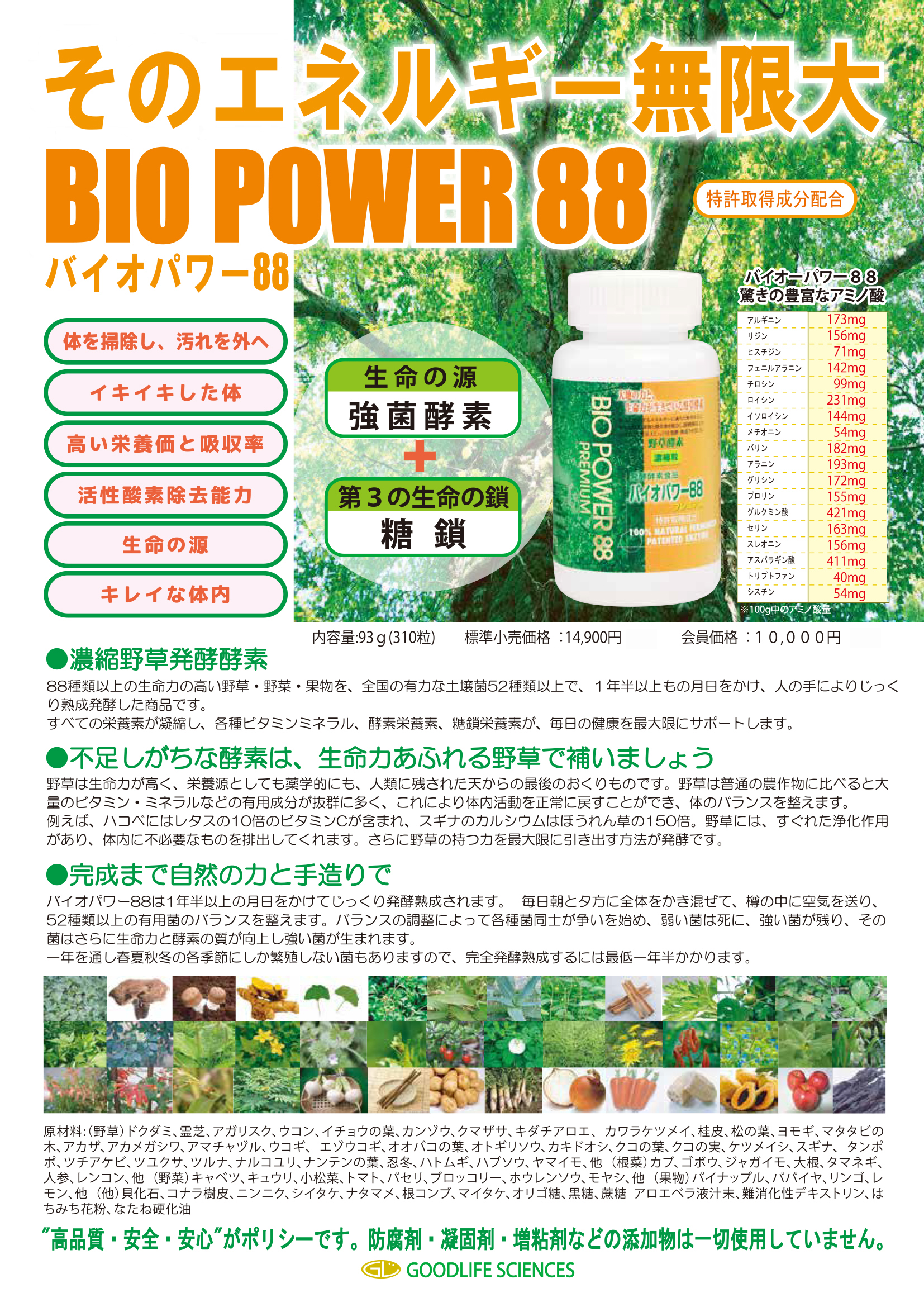 原材料/(野草)ドクダミ、霊芝、アガリクス、ウコン、イチョウの葉、カンゾウ、クマザサ、キダチアロエ、 カワラケツメイ、桂皮、松の葉、ヨモギ、マタタビの木、アカザ、アカメガシワ、アマチャヅル、ウコギ、 エゾウコギ、オオバコの葉、オトギリソウ、カキドオシ、クコの葉、クコの実、ケツメイシ、スギナ、 タンポポ、ツチアケビ、ツユクサ、ツルナ、ナルコユリ、ナンテンの葉、忍冬、ハトムギ、ハブソウ、ヤマイモ、他 (根菜)カブ、ゴボウ、ジャガイモ、大根、タマネギ、人参、レンコン、他 (野菜)キャベツ、キュウリ、小松菜、トマト、パセリ、ブロッコリー、ホウレンソウ、モヤシ、他 (果物)パイナップル、パパイヤ、リンゴ、レモン、他 (他)貝化石、コナラ樹皮、ニンニク、シイタケ、ナタマメ、根コンブ、マイタケ、オリゴ糖、黒糖、蔗糖 アロエベラ液汁末、難消化性食物繊維、はちみち花粉、なたね硬化油