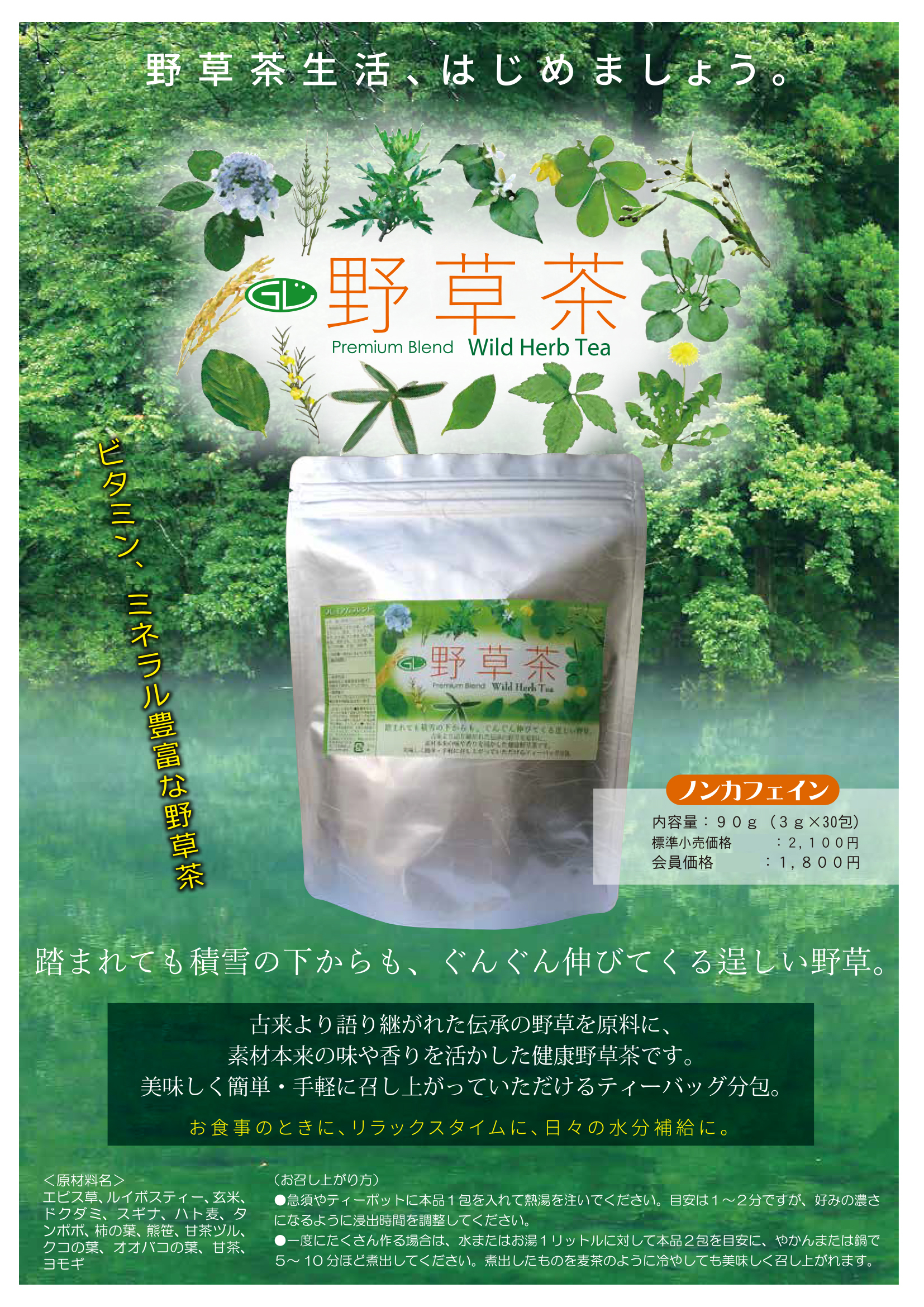 原材料/ エビス草、ルイボスティー、玄米、ドクダミ、スギナ、ハト麦、タンポポ、柿の葉、熊笹、甘茶ヅル、クコの葉、オオバコの葉、甘茶、ヨモギ